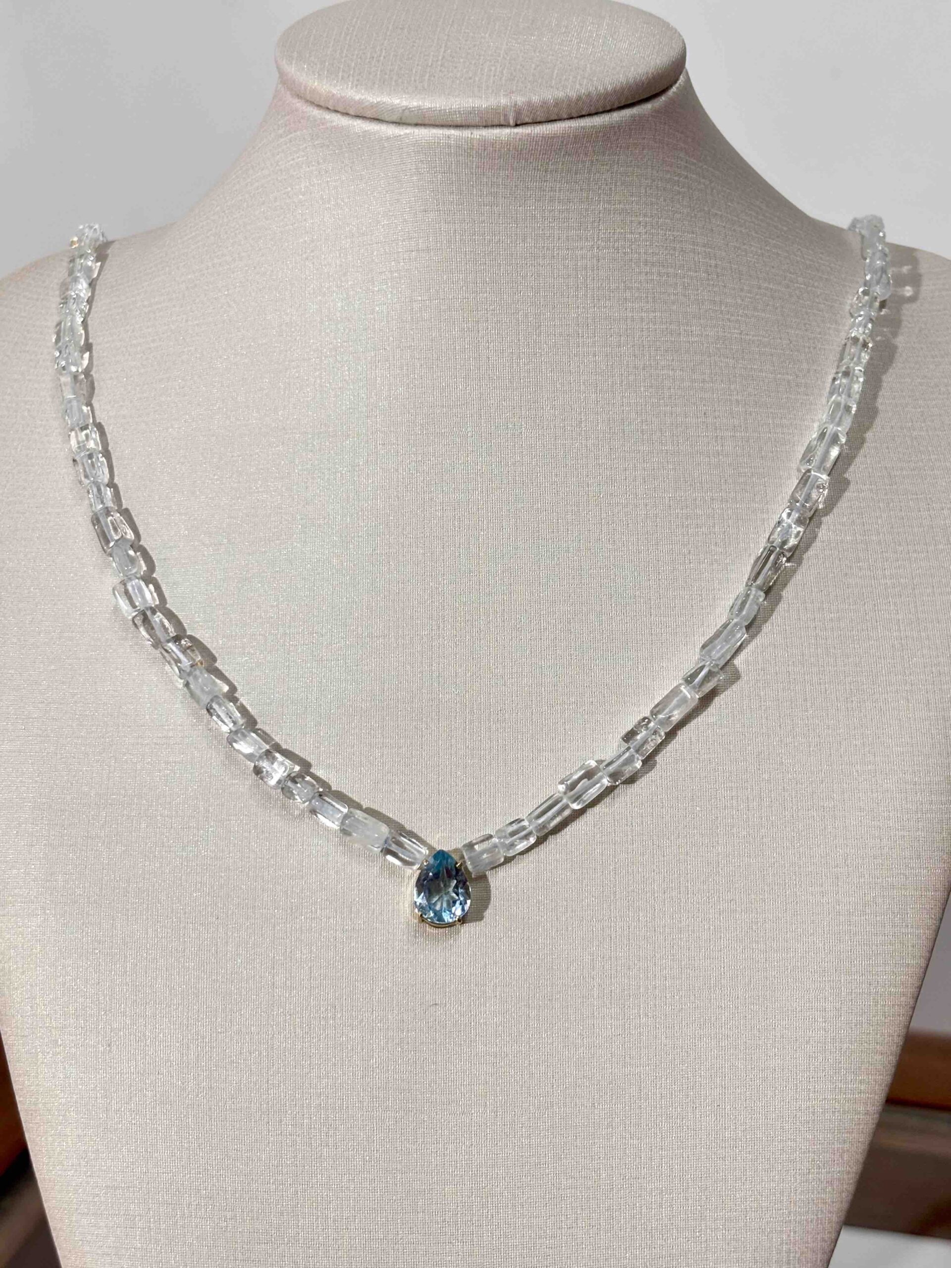 Colar de topázio transparente e pingente em ouro 18k, adornado com topázio azul sky em formato de gota. Acompanha fecho em ouro 18k.