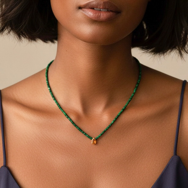 Fio de malaquita em cubos (2 x 2,4 cm) e pingente em formato de gota em ouro 18k, adornado com citrino. Acompanha fecho e acabamento em ouro 18k