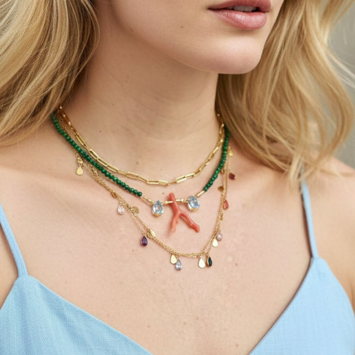 Colar de Malaquita, Ouro 18k, Coral e Topázio Azul