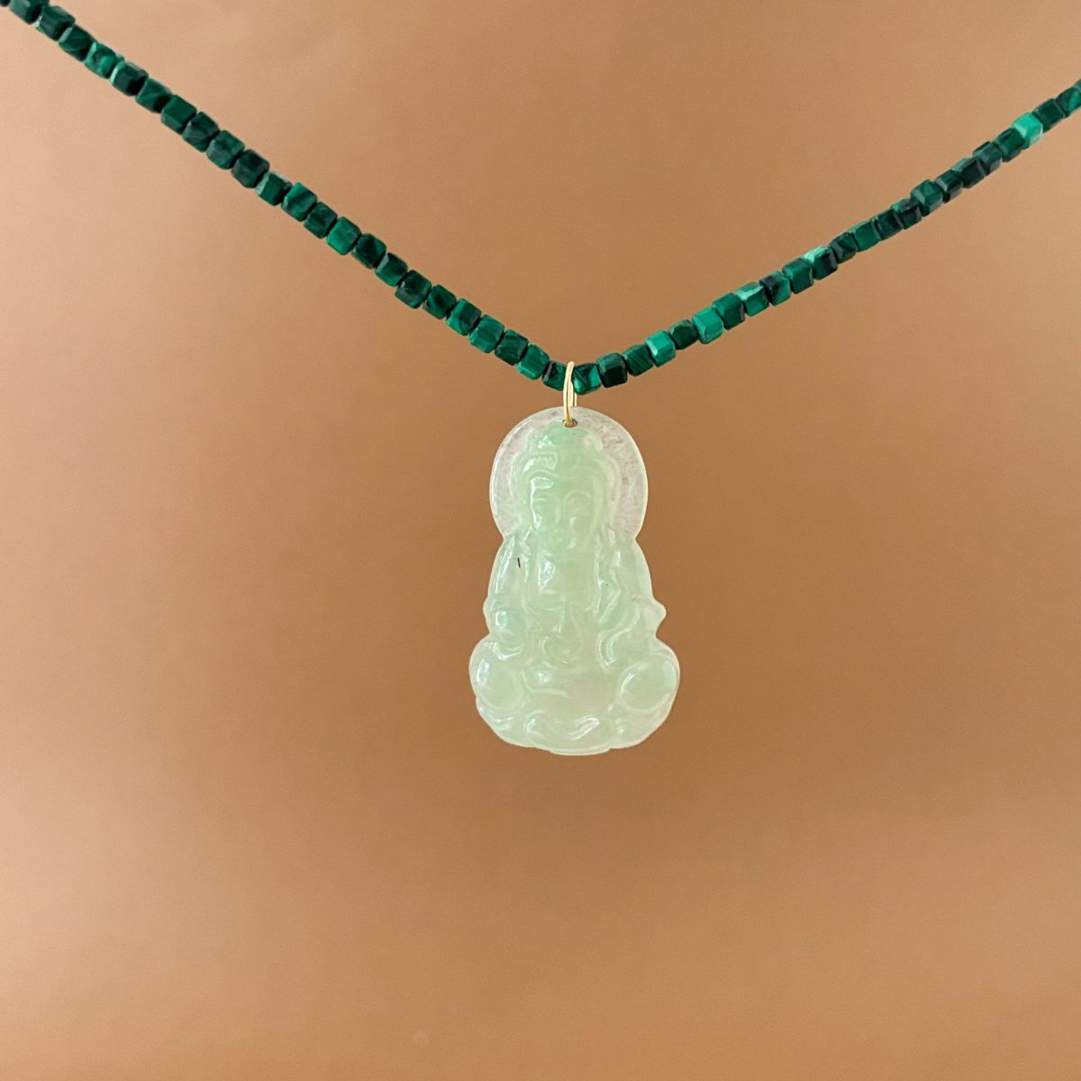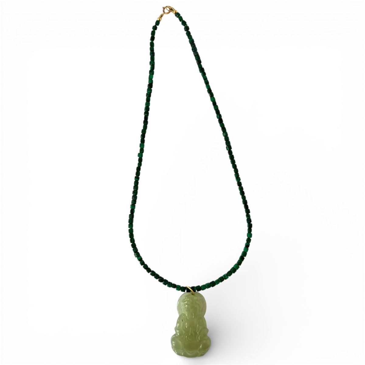 Colar de malaquita natural e pingente antigo de jade translúcida chinesa, representando a Deusa Kwan Yin. Acompanha fecho de ouro 18k.
