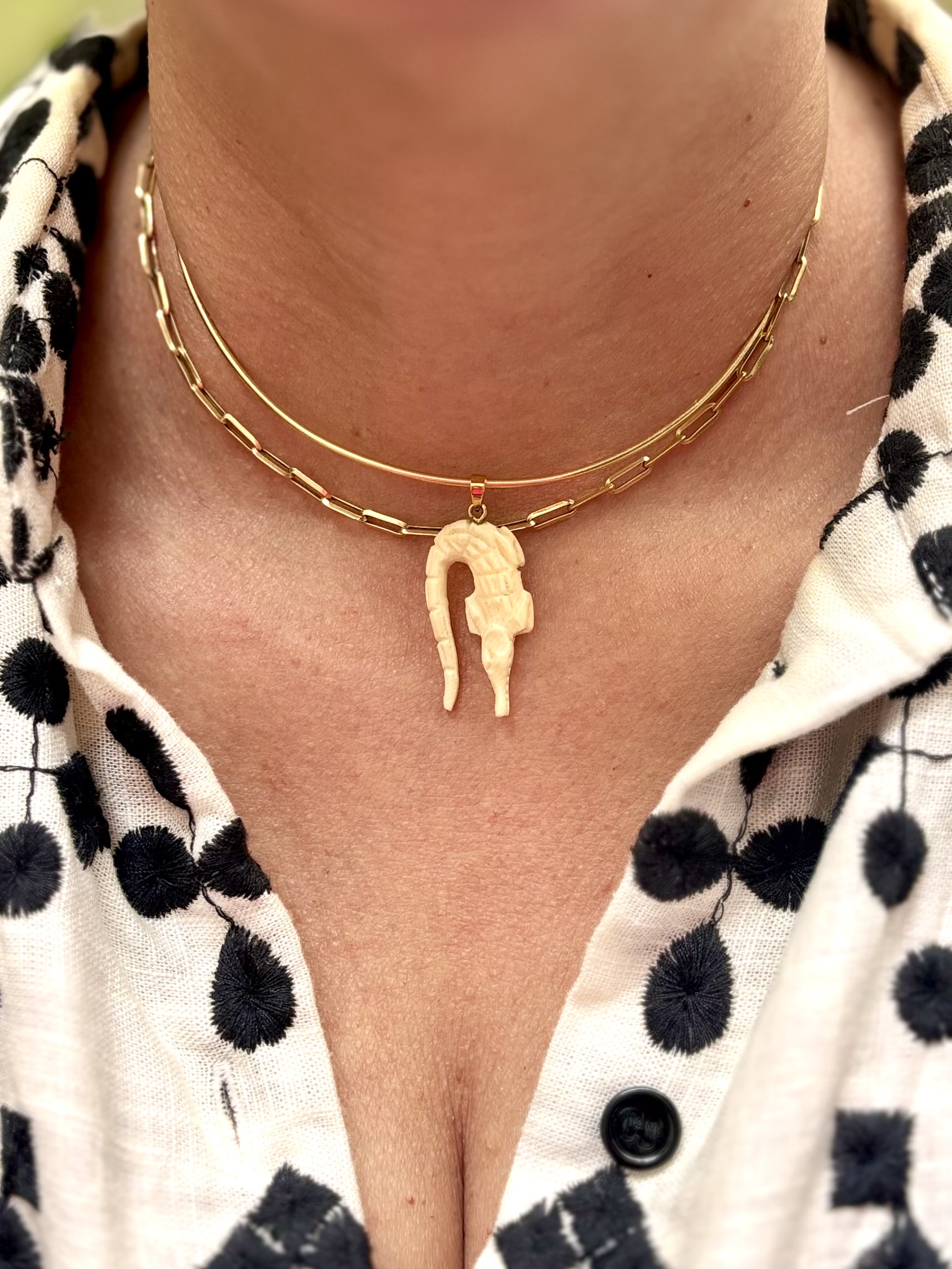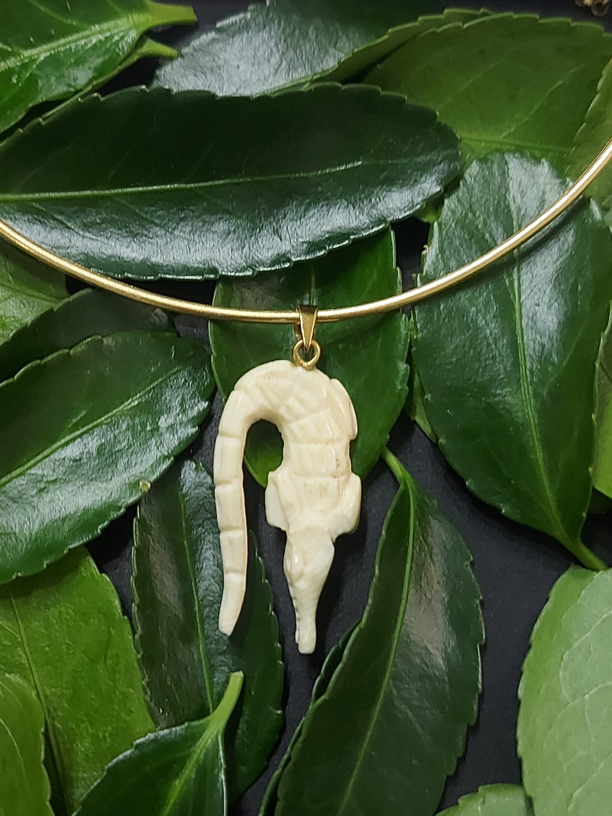 Pingente em marfim em formato de jacaré e acabamentos em ouro 18k.